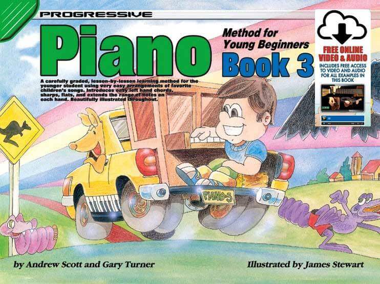 PROGRESSIVE PIANO FOR YOUNG BEGINNERS - A carefully graded, lesson by lesson learning method for the younger student using very easy arrangements of favorite children's songs. Introduces easy left hand chords, sharps, flats, and extends the range of notes on each hand. Beautifully illustrated throughout in full color. Songs include: Ode to Joy, How Dry I Am, Ten Little Indians, Beautiful Brown Eyes, Roses From the South and many more. Video for all exercises available for free online.